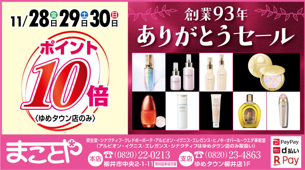 また、ゆめタウン店では、11月28日(金)、29日(土)、30日(日)の3日間、 お買い物をすると「ゆめカードポイント10倍」のチャンスです。 ぜひ、お出かけください。