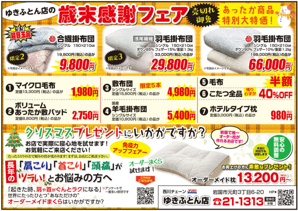 岩国市にあります「ゆきふとん店さん」では、歳末感謝フェアを開催!