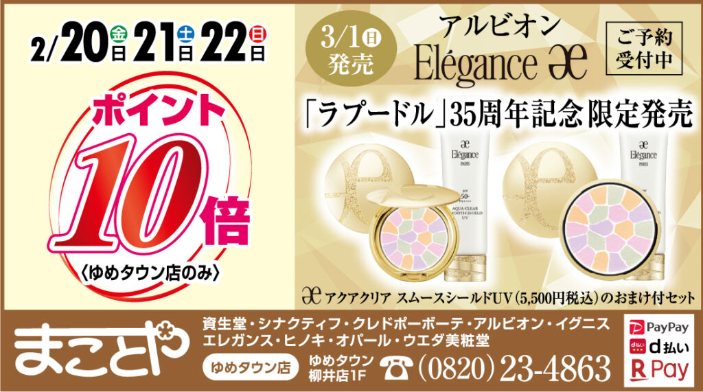 柳井エリア2026.02.19エレガンス限定キット発売! まことやさんからお知らせ♪3/1(日) エレガンス ラ プードルシリーズ限定キットが発売されます。エレガンス アクアクリア スムースシールドUVのおまけ付セット!まことやさんに、ぜひお問い合わせを!