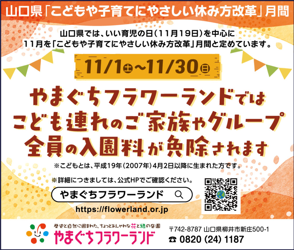 やまぐちフラワーランドさんでは11月30日(日)まで、こども連れのご家族やグループ全員の入園料が免除されます。11/22(土)~24(月)、三連休の方が多いと思いますが、ぜひ、この機会にご家族・グループでお出かけください。