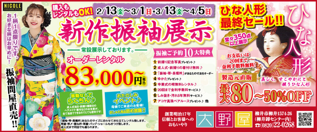 柳井市の大野屋さんで「新作振袖展示」開催中!