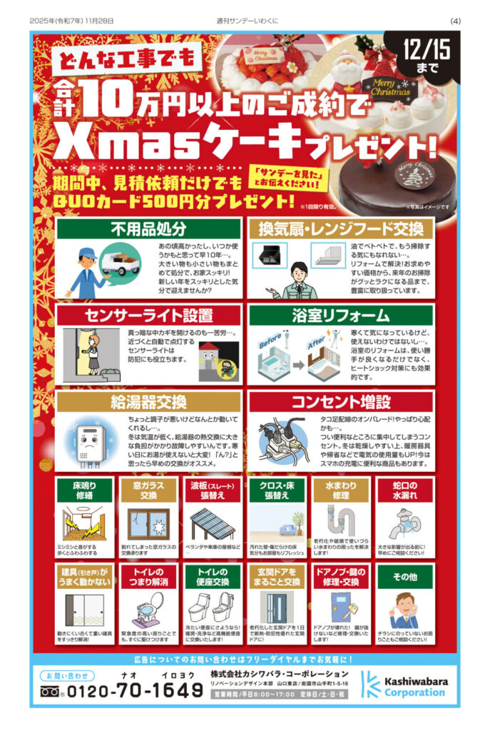 どんな工事でも「カシワバラ」に依頼すれば「クリスマスケーキ」をプレゼント中🍰✨