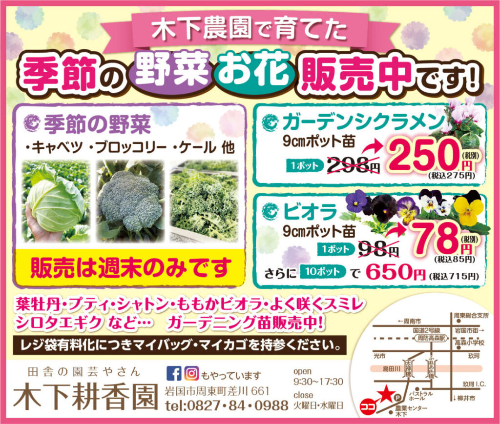岩国市周東町にある木下耕香園さんではただいま季節の「野菜」「お花」販売中です✨