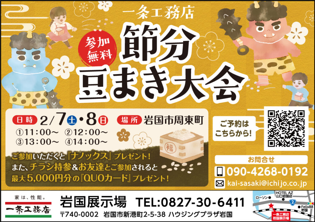 岩国エリア2026.02.07本日と明日「節分 豆まき大会」開催! 本日と明日、岩国の一条工務店さんが「節分 豆まき大会」を開催します。予約制で参加無料!プレゼントもあります!!くわしくは下の広告をご覧ください。