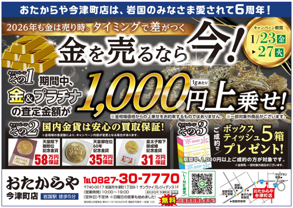 このようなキャンペーンがついてくる今!!お家に眠っている貴金属や金貨がございましたら、ぜひ“おたからや今津町店さん”へ行かれてみてくださいね💰